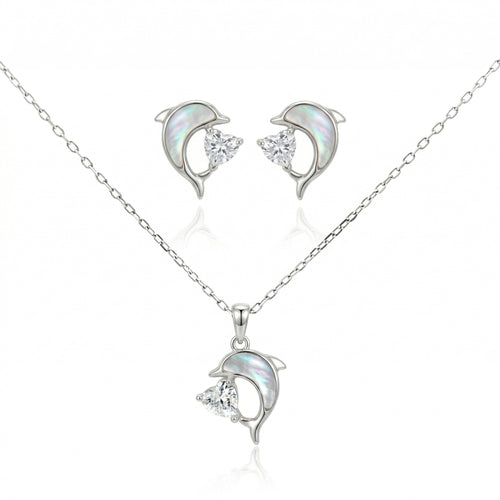 925 Silver Dolphin Heart Zircon Pendant Necklace & Earrings Set – Elegant Pearl Shell Jewelry for Women